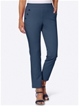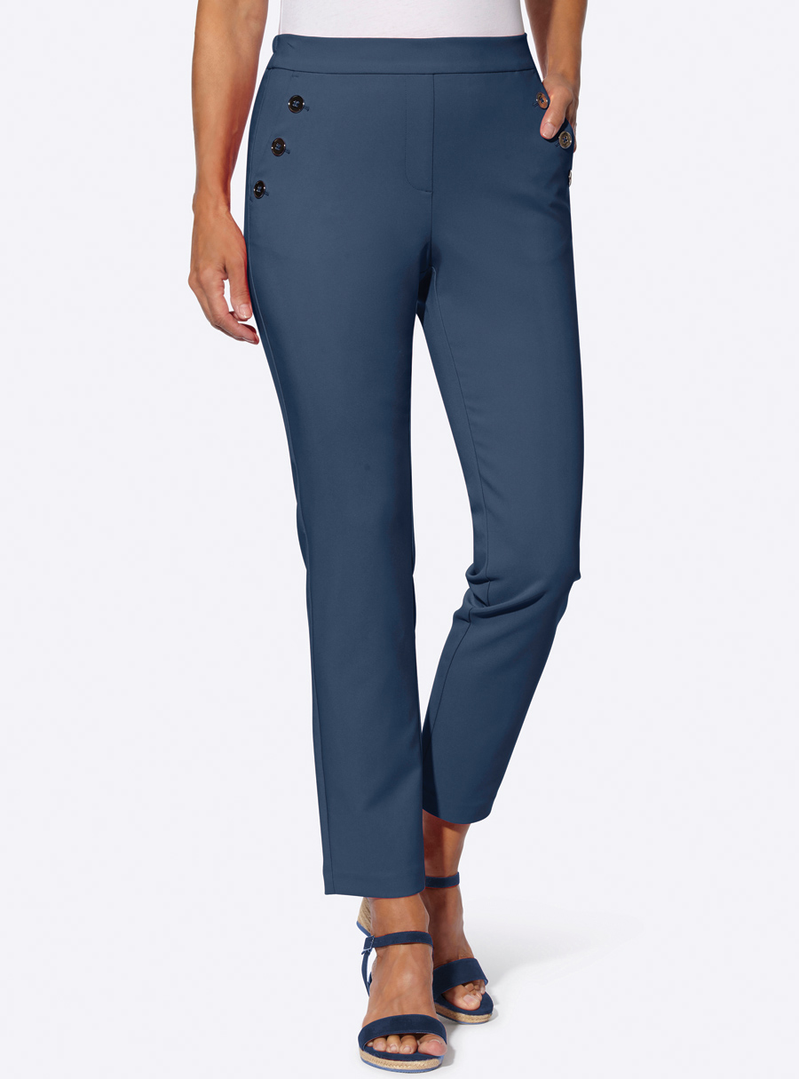 Wonderfully comfortable pull-on trousers that feel good and cut a flattering figure. Smooth waistband at the front, imitation zipper fly and 2 side pockets with decorative buttons. Stretch waistband at the back. 89% Polyester, 11% Elastane.