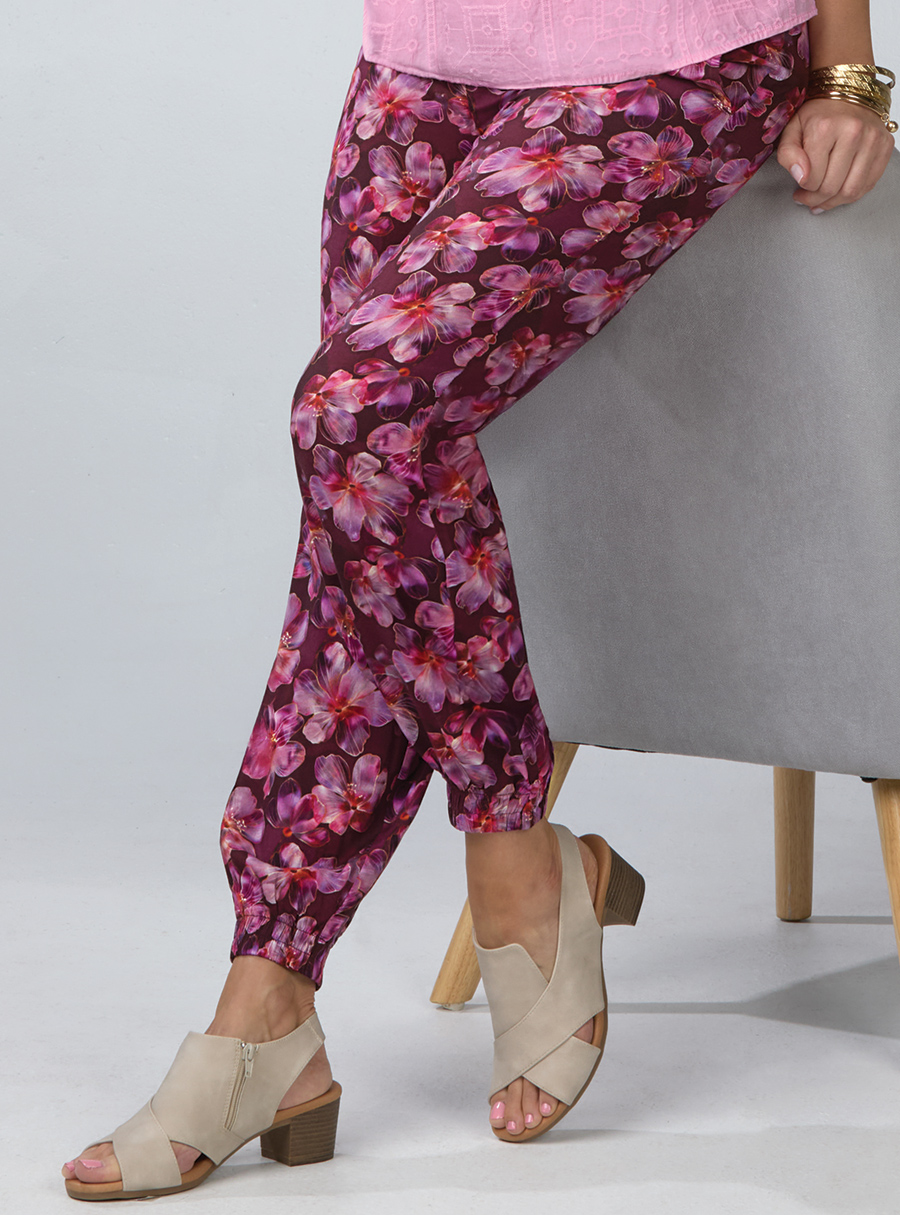 Effortless comfort meets standout style. Featuring an easy pull-on waistband and gently gathered cuffs, these pants offer a breathable, lightweight feel with a flattering drape. The perfect mix of casual chic and everyday wearability. 100% Viscose.