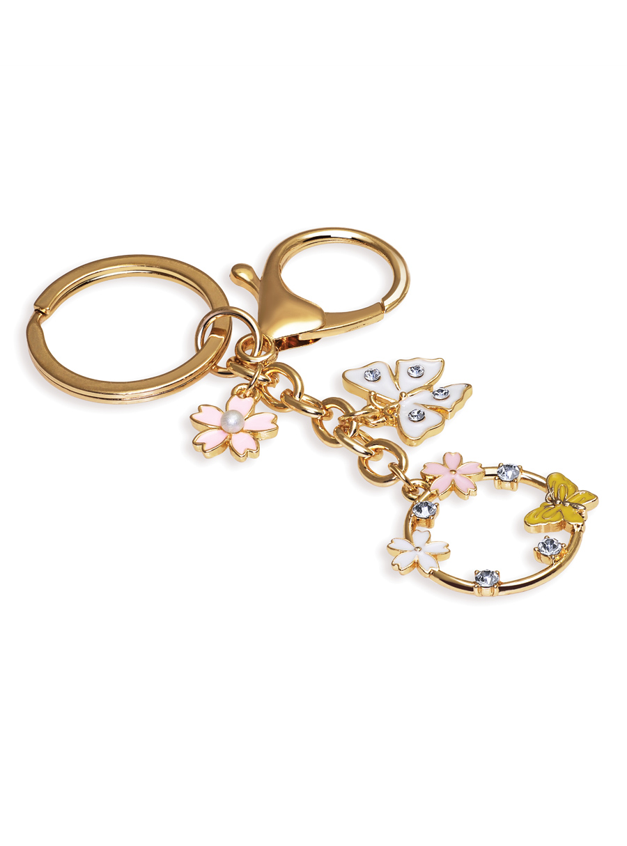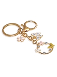 Gold tone alloy key chain/handbag charm with clear crystals & faux pearl. Length 9 cm.
