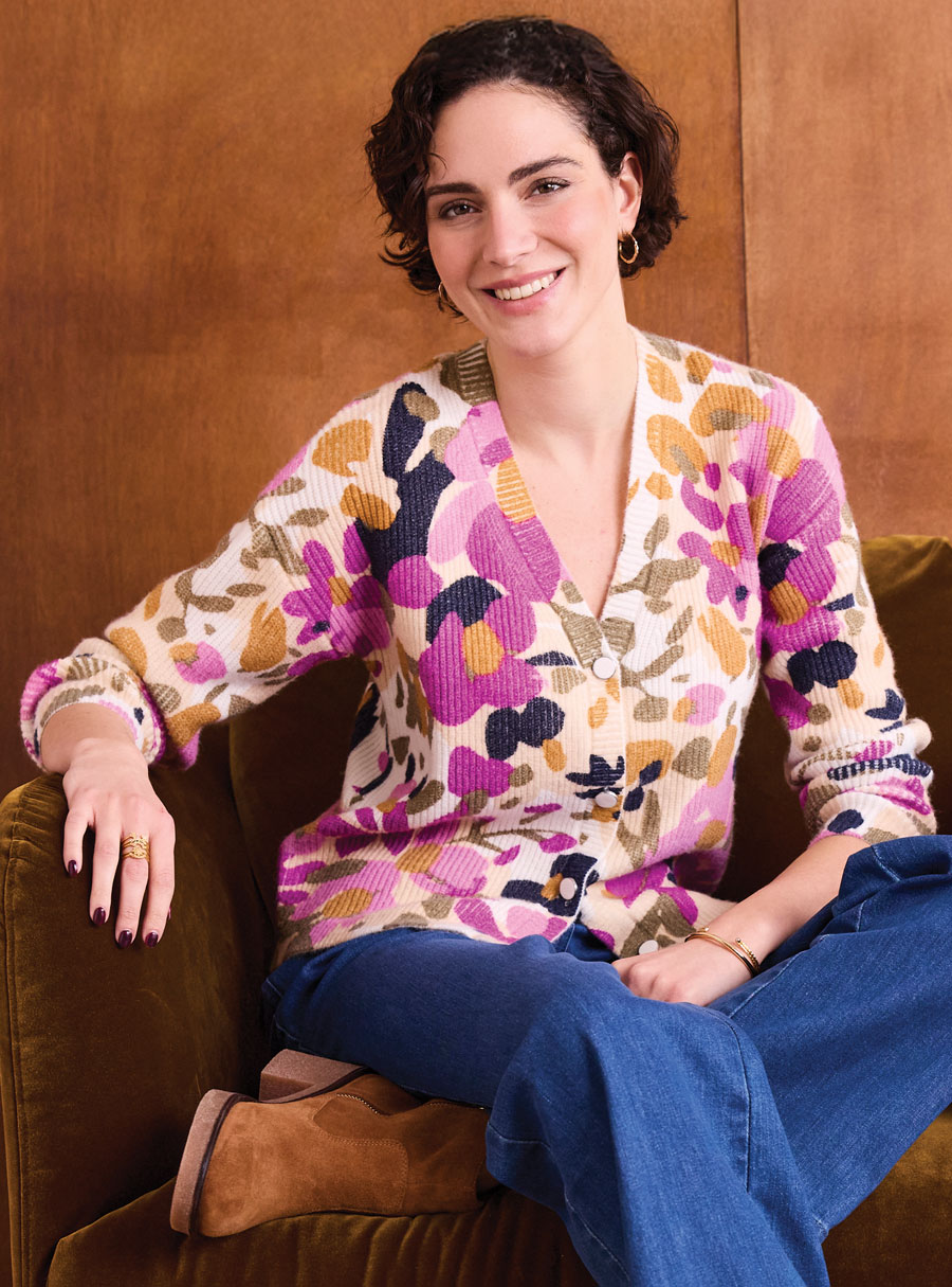 Soft ribbed knit with floral print, V-neck and dropped armholes. Buttoned with silver-rimmed enamel buttons. 39% Acrylic, 33% Polyester, 28% Polyamide.