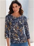 The soft quality of this brilliant print shirt with a floral design looks like the finest knit. 3/4-length sleeves. 95% Polyester, 5% Elastane.