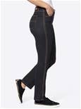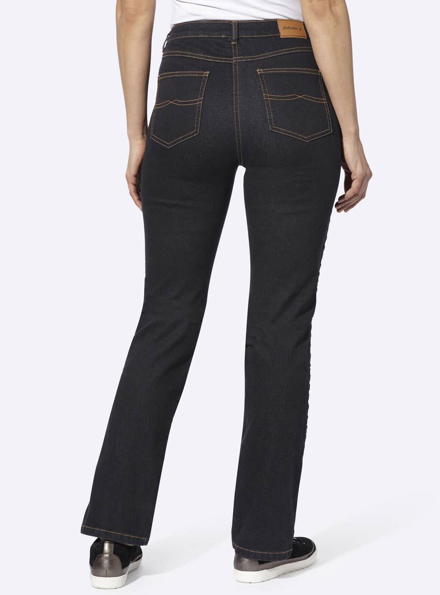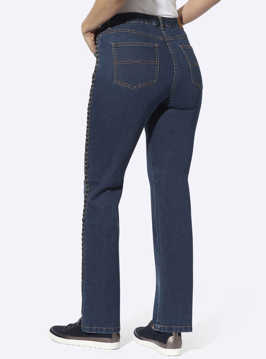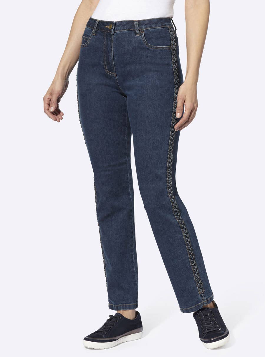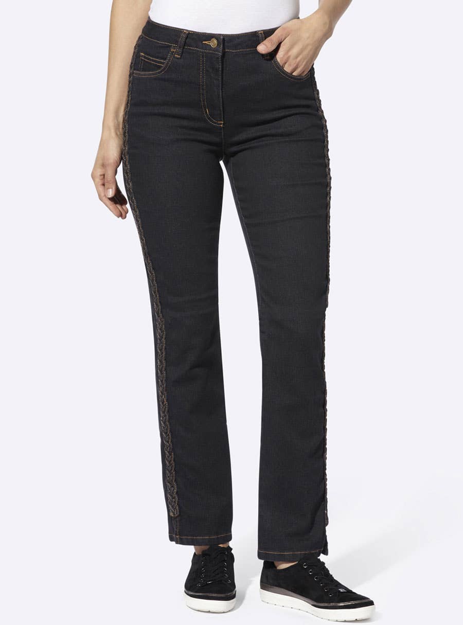 5-pocket jeans with visually elongating braided trim along the side seams. Belt loops, button and zipper closure. Belt not included. 79% Cotton, 19% Polyester, 2% Elastane.