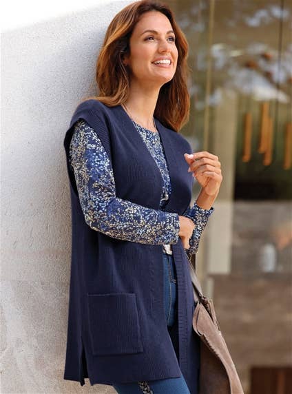 Concealing in length, wonderfully soft and fluffy to the touch: long knit vest in a visually stretchy ribbed knit and fashionable open shape. With dropped shoulders and a ribbed trim at the armhole. Patch pockets and side slits. Wintery, warm material blend with viscose. 50% Viscose, 28% Polyester, 22% Polyamide.