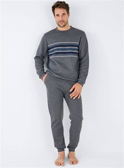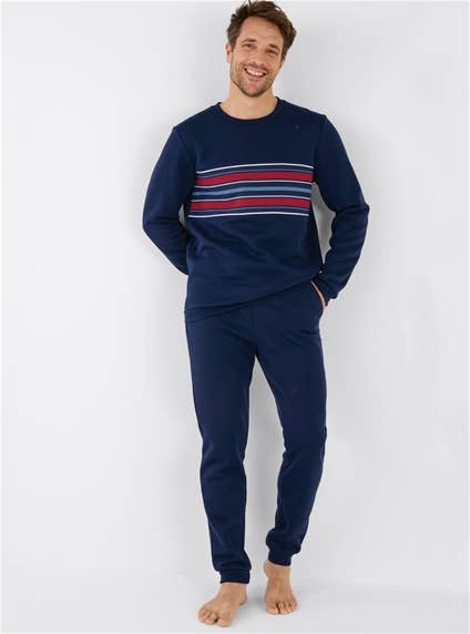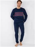 Top features a round neck, ribbed finishes and stripes, with jogging-style eastic waist pants drawstring and two pockets. Polyester, Cotton.