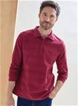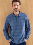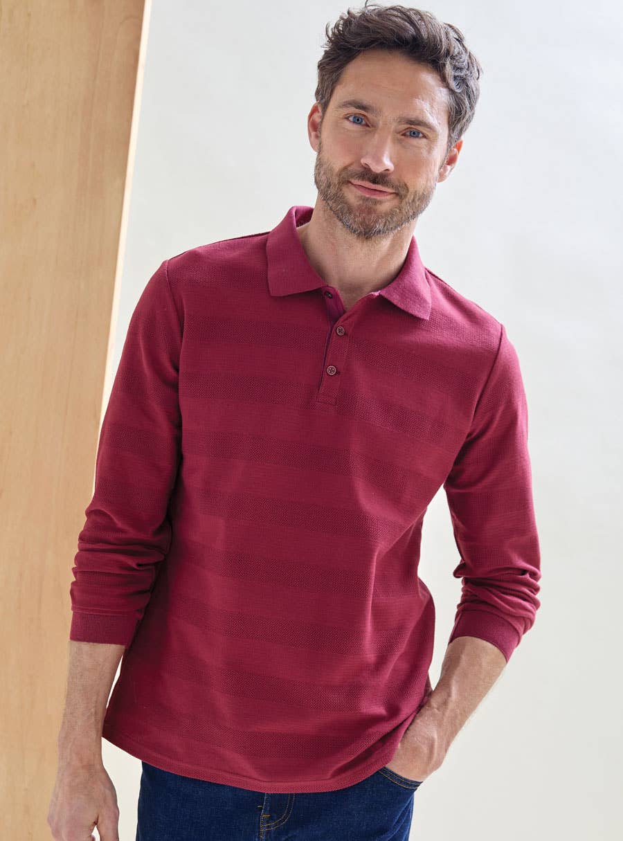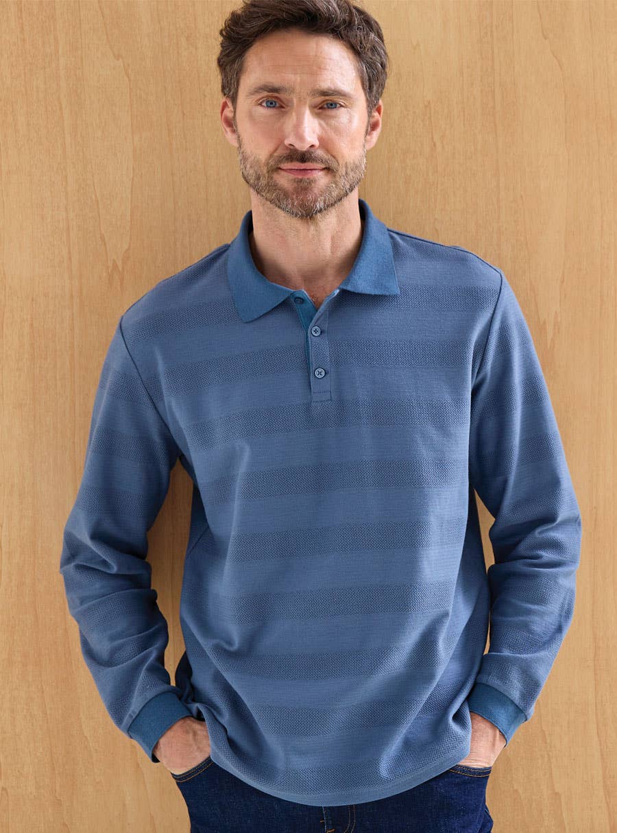 Pure soft Cotton textured striped knit polo features a ribbed polo collar, buttoned placket and ribbed cuffs. Cotton.