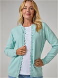 Perfect for everyday wear! Endlessly soft, our long sleeved crew neck cardigan features pretty scallop detailing. 100% Merino Wool.