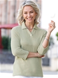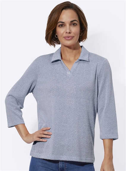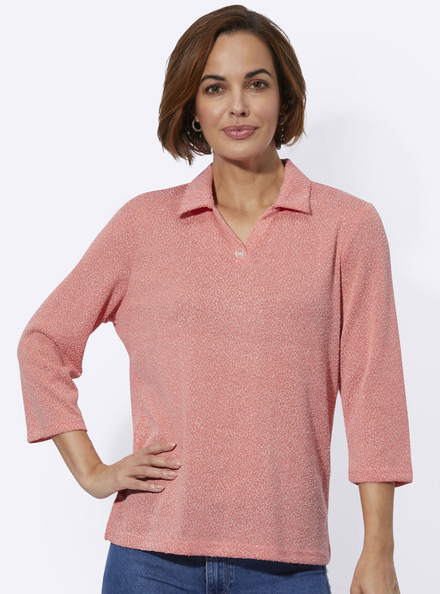 Lightly mottled and wonderfully versatile: polo shirt in bouclé fabric. With an open V and a decorative button. 3/4-length sleeves. Side slits.