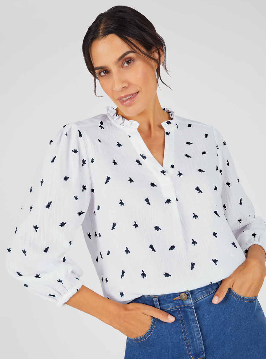 Enjoy the comfort of this cotton gauze blouse, a light and soft textured material that you’ll love to wear. The pretty delicate embroidery and ruffled collar gives this top an elegant feminine touch. Pair it with jeans and sneakers for a casual chic look. 100% Cotton.