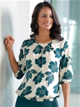 In an attractive floral design, this blouse pampers you with its soft viscose quality. A round neckline with pleats that drapes beautifully and gives a flattering silhouette. Elastic cuffs on the ¾ length sleeve and hem. 100% Viscose.