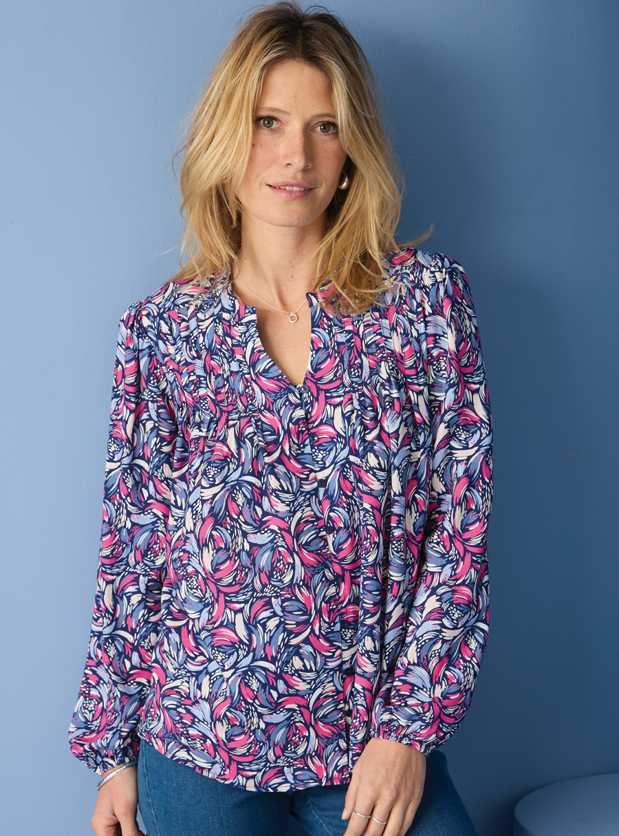 Split collar printed blouse with elastic sleeve cuffs in pretty feminine prints. 100% Viscose.