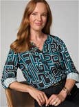 The graphic design of this print blouse is made up of large letters. Round neckline with a small V and short button placket. The long sleeves with button cuffs can be casually rolled up to 3/4 length. Wide pleat below the back yoke. Rounded hem. Viscose.