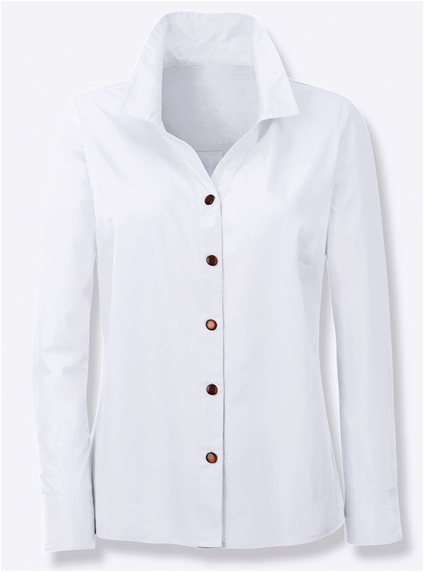 Easy to combine blouse with a shirt collar, small V-neckline and long sleeves with button cuffs. The contrasting-coloured buttons add accents. The bust darts and shoulder yoke at the back ensure a perfect fit, while the box pleat at the back provides plenty of freedom of movement.