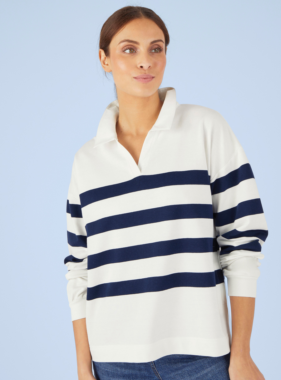 Soft, striped and effortlessly cosy. This fleece sweatshirt blends comfort with casual style, featuring polo style collar, drop sleeves, side pockets and a relaxed fit. 60% Cotton, 40% Polyester.