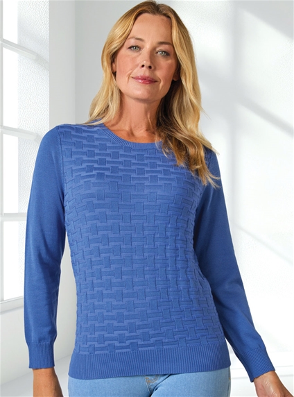 Long sleeve jumper featuring basket weave front panel and ribbed cuff for a clean and classic look.