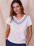 Pure Cotton V neck Tee with embroidery and beaded detail. Blue tones to pair back with your favourite pair of jeans. 100% Cotton.