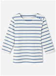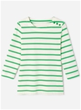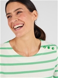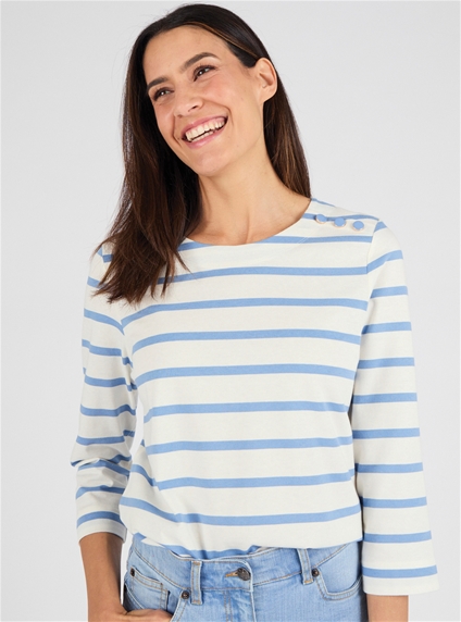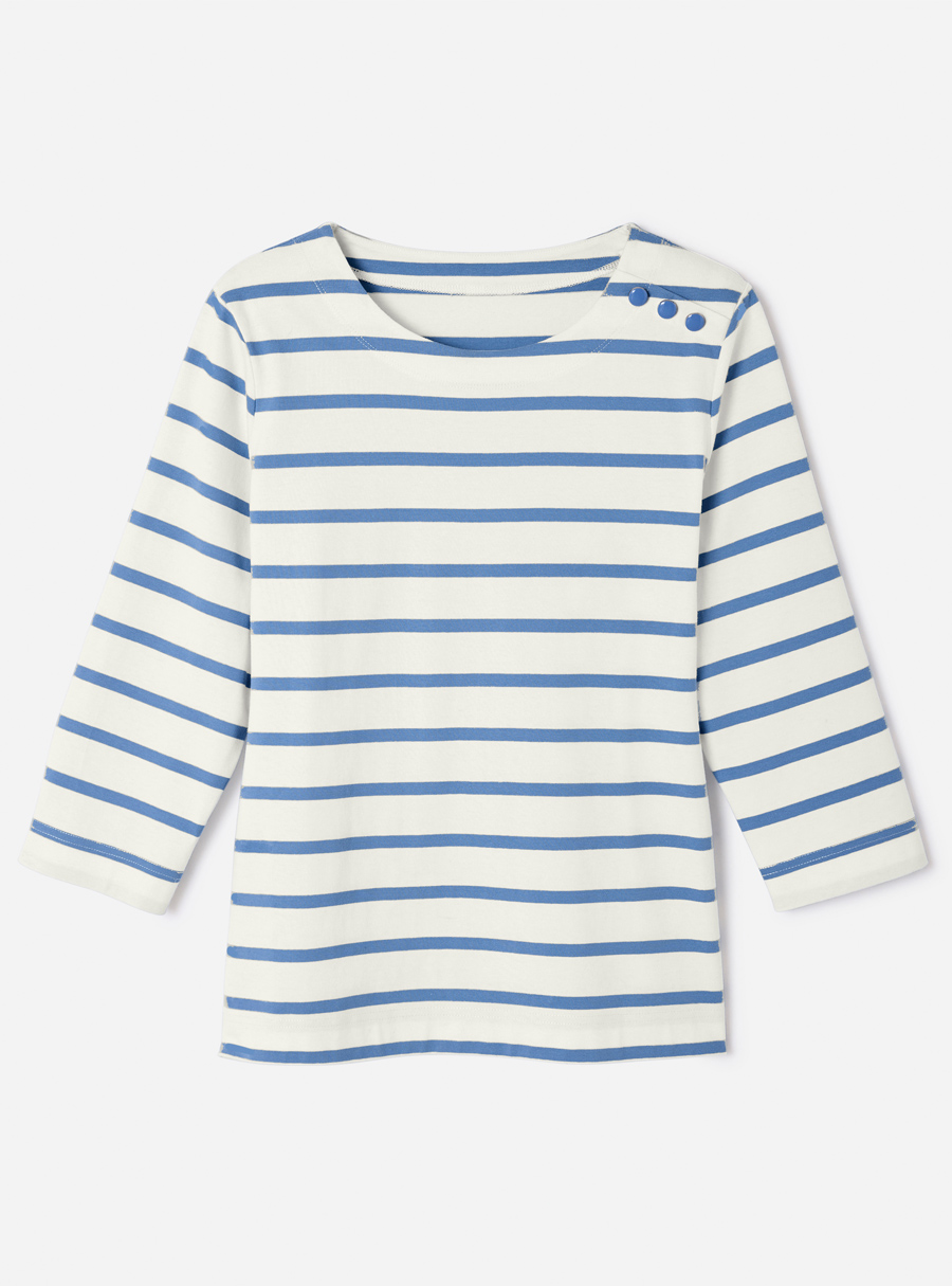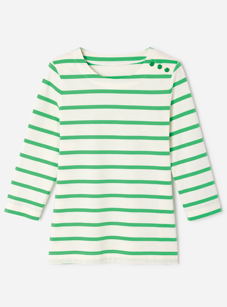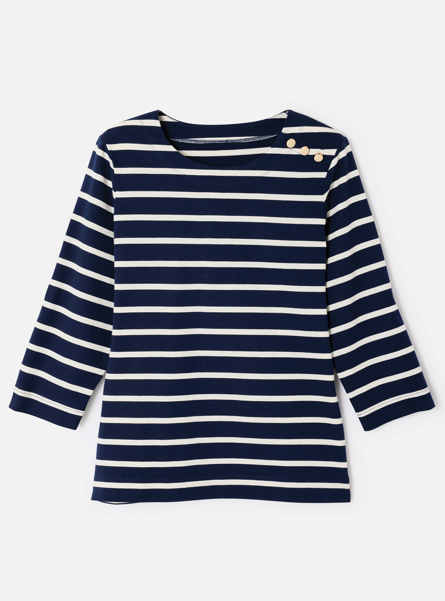 Pure cotton striped jersey t-shirt with boat neck, 3/4 sleeves and a faux shoulder placket with gold-tone buttons. Perfectly aligned stripes for a polished finish. 100% Cotton.