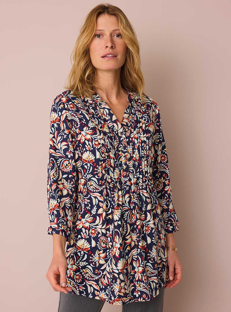 Designed for style, this tunic is adorned with an all over paisley print. An open V neckline with a short button placket and pleats. 3/4 length sleeves with button cuffs and side slits for ease of wear. 100% Viscose.